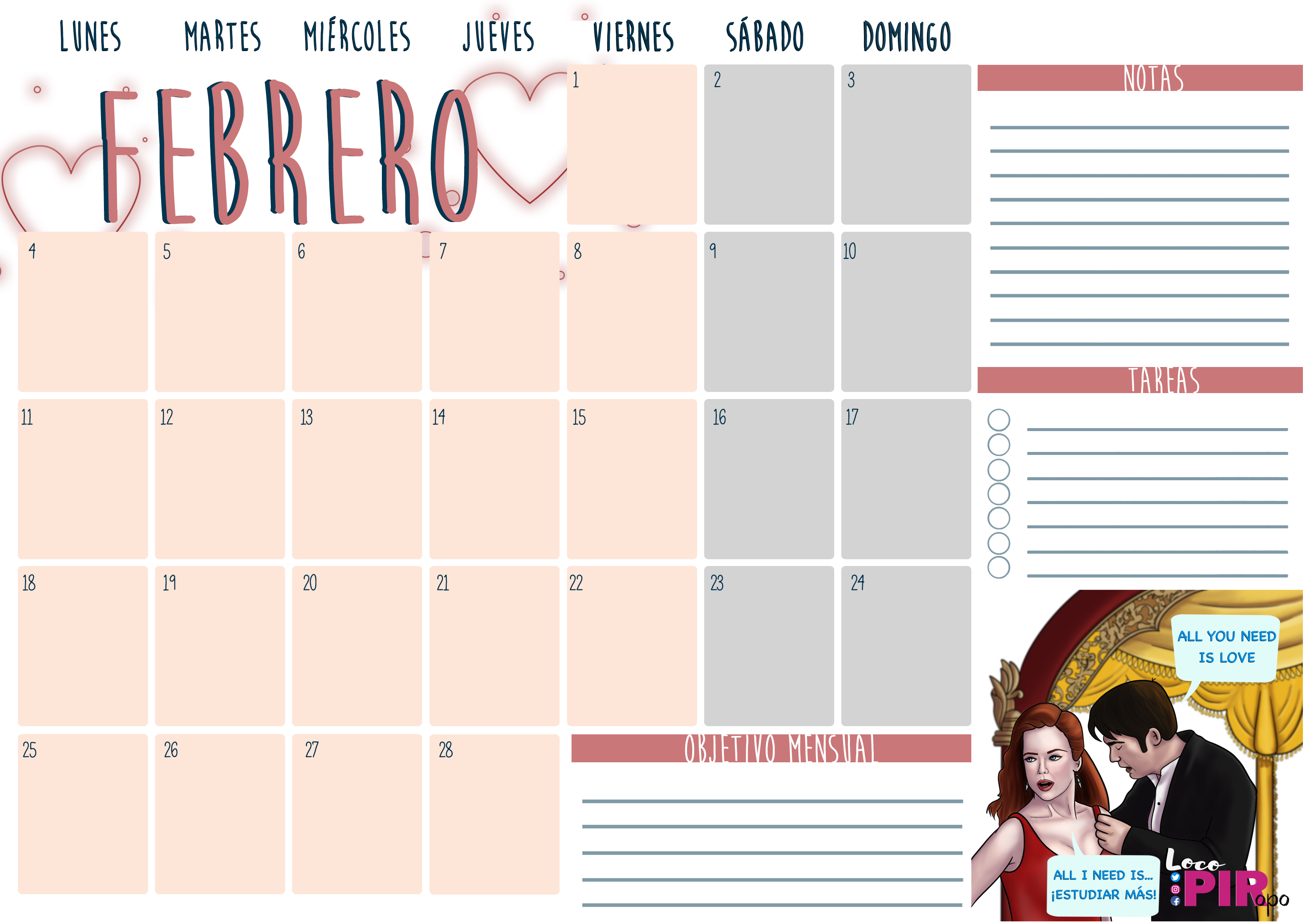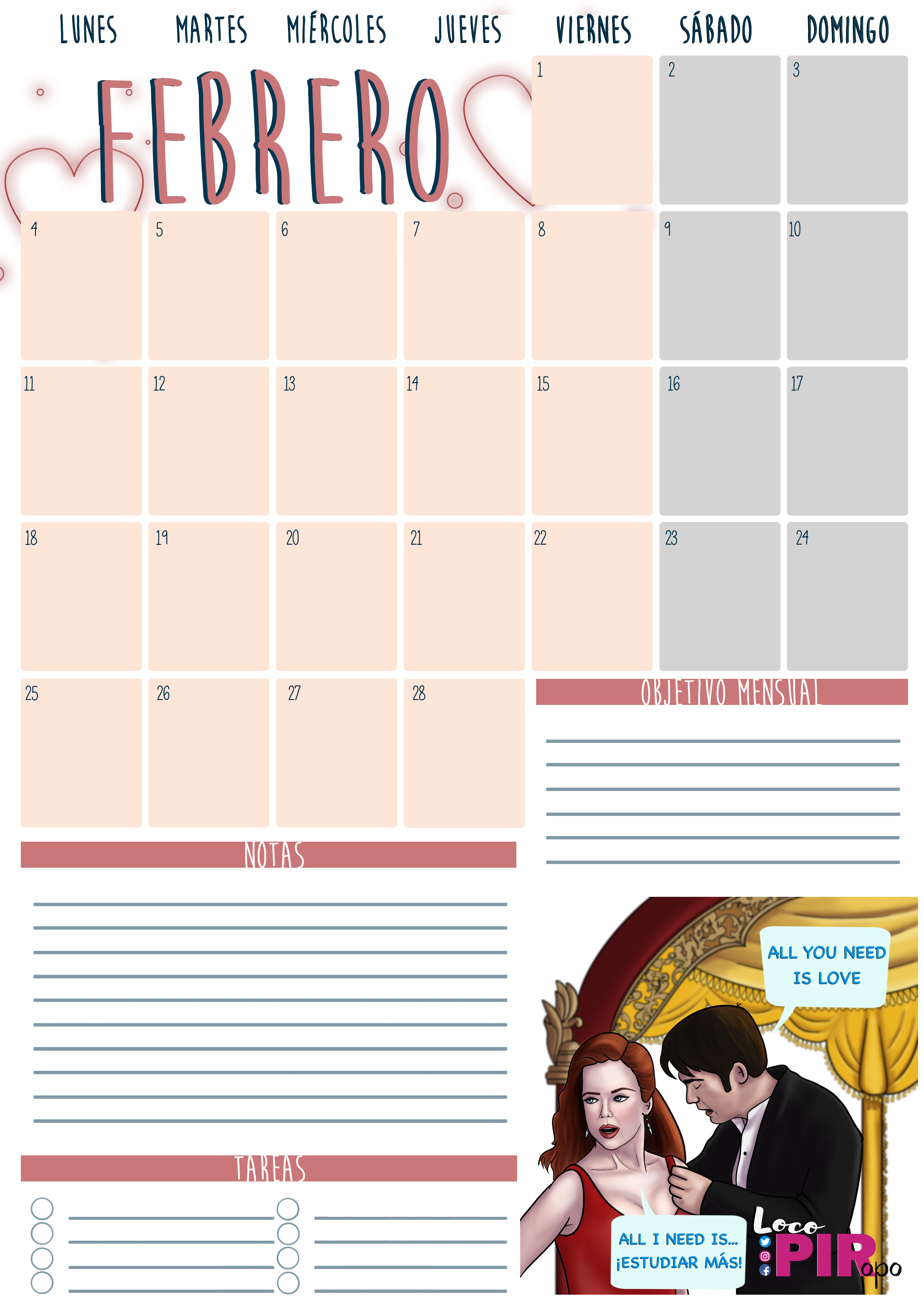 Febrero es el mes más corto del año y el mes en el que se celebra San Valentín. He querido utilizar este día para «ambientar» el planning de este mes, así como la viñeta que le acompaña. Para ello, he utilizado unos tonos tirando a rojo y una decoración típica para este día.