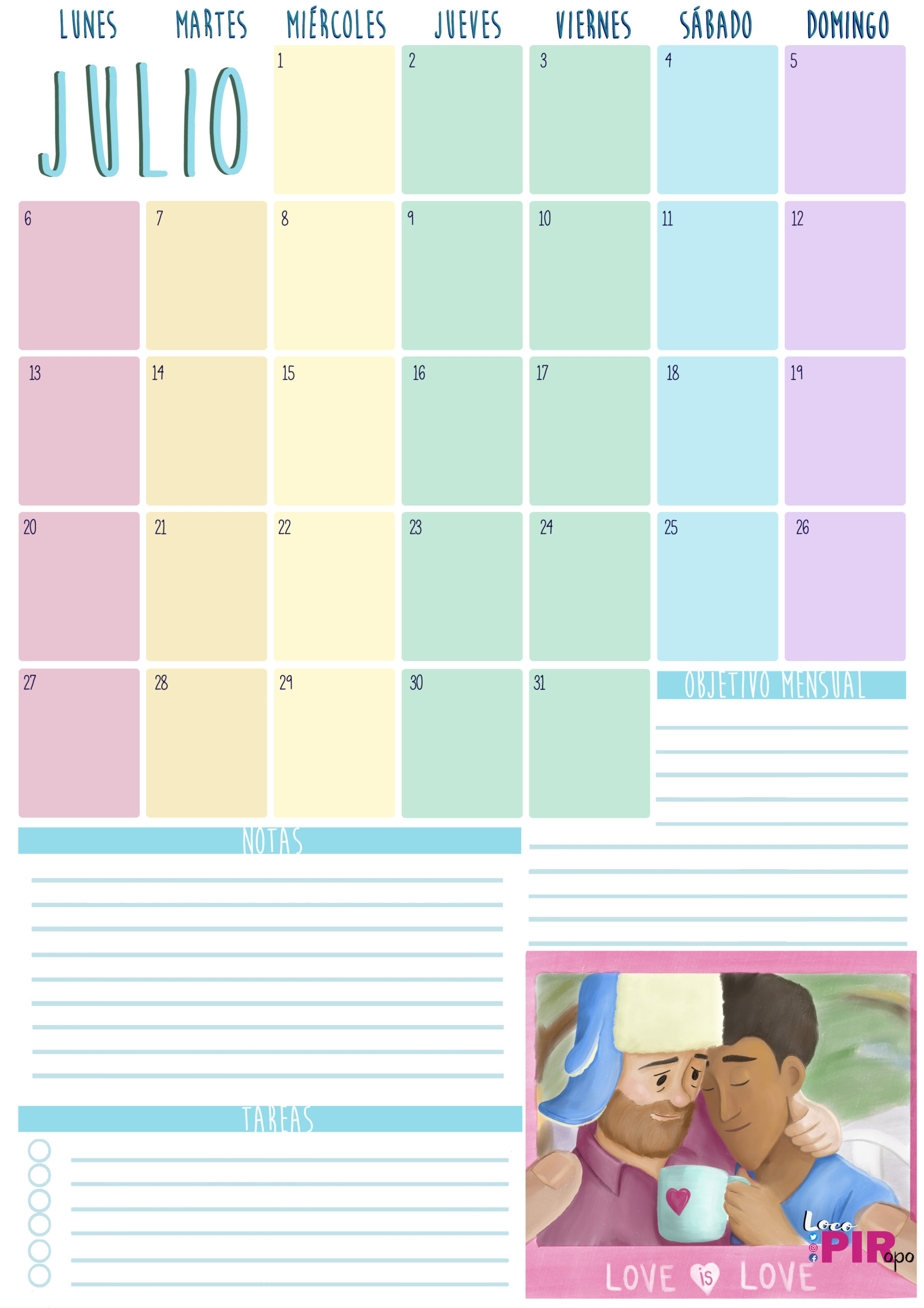Bueno, ya os dejo con el planning de julio para que lo podáis descargar. Lo tenéis tanto en su versión horizontal como en vertical, para que elijáis el que más se adapte a vuestras necesidades.