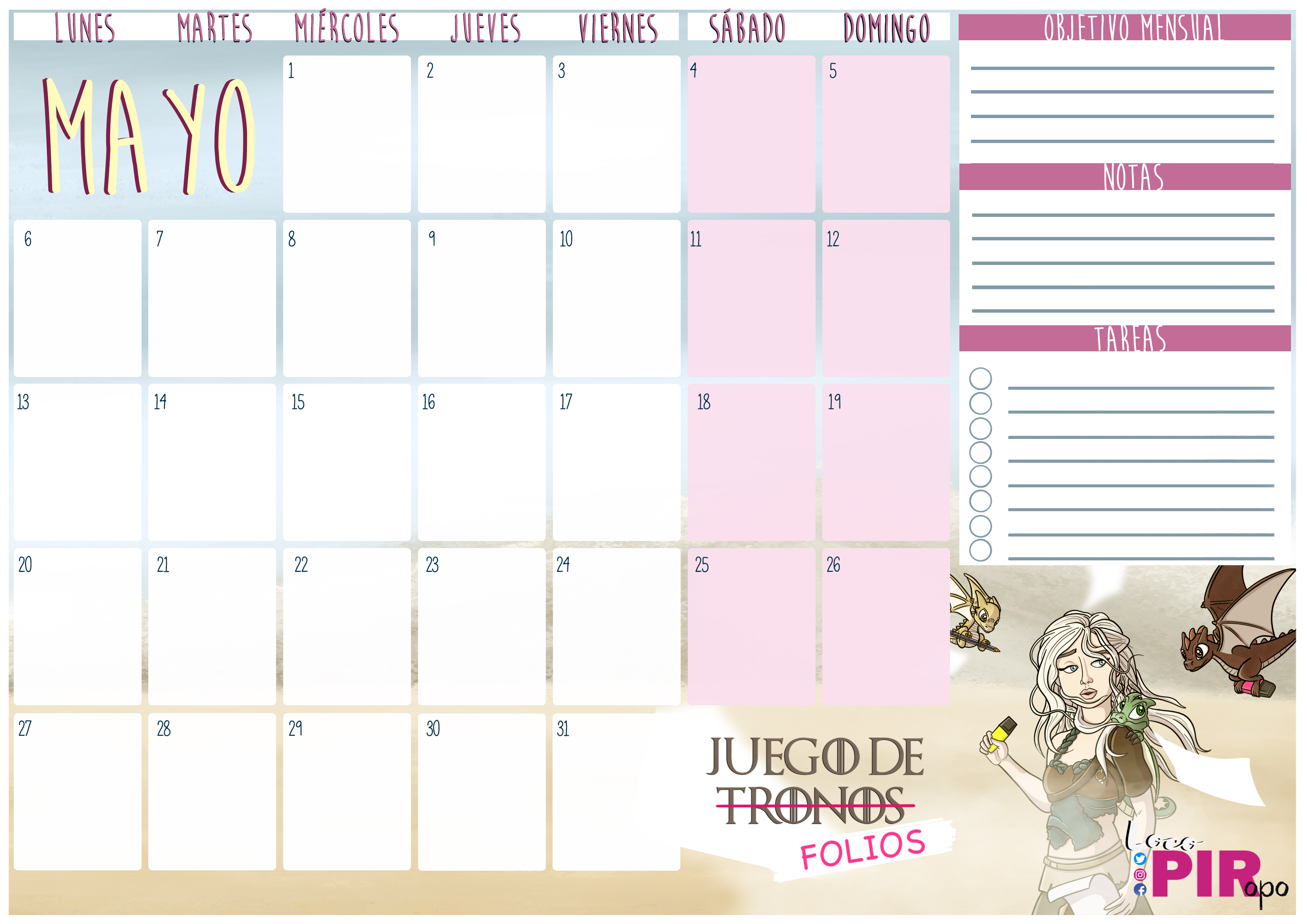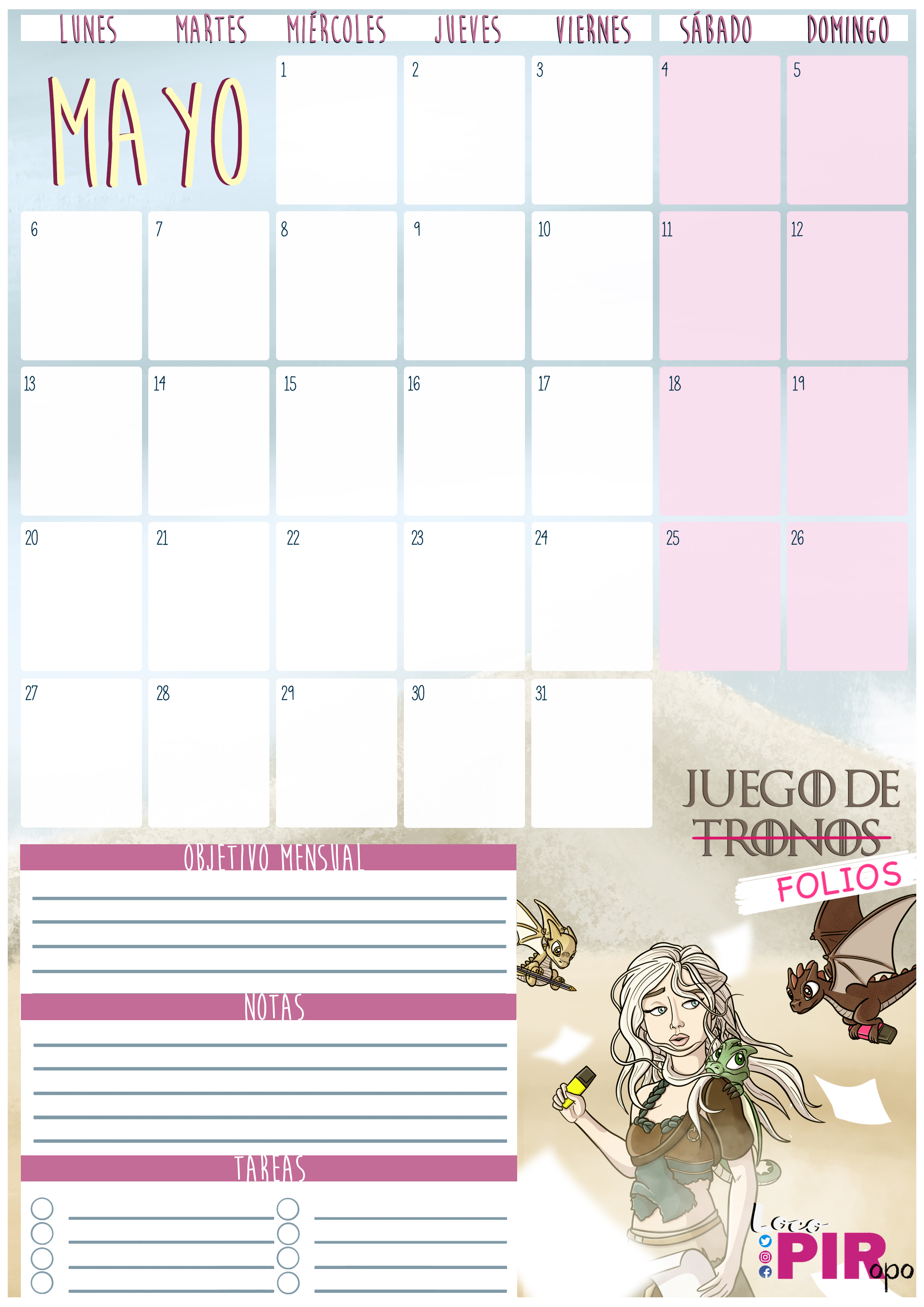 Madre de Dragones. Será ella quien os acompañe durante todo el mes de mayo y hará que cumpláis todos vuestros objetivos. Espero que el planning os guste tanto como el de Jon Nieve. Sin más, os dejo con él para que podáis descargarlo en la versión que más os guste:
