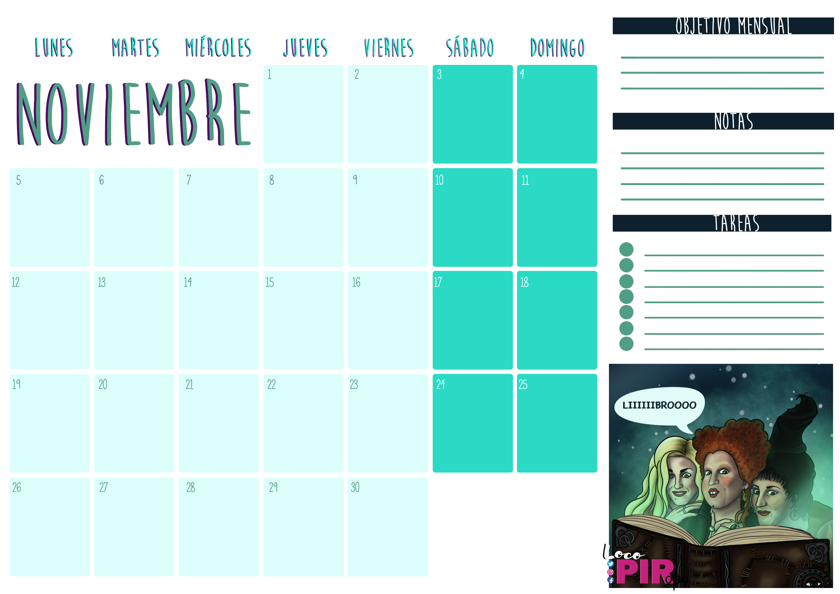 Para el mes de noviembre os traigo un planning que seguro que os hace volver a vuestra infancia. En esta ocasión, la viñeta está inspirada en una película de mi infancia y, estoy seguro, que todos/as vosotros/as la habéis visto: Hocus Pocus o El retorno de las brujas.