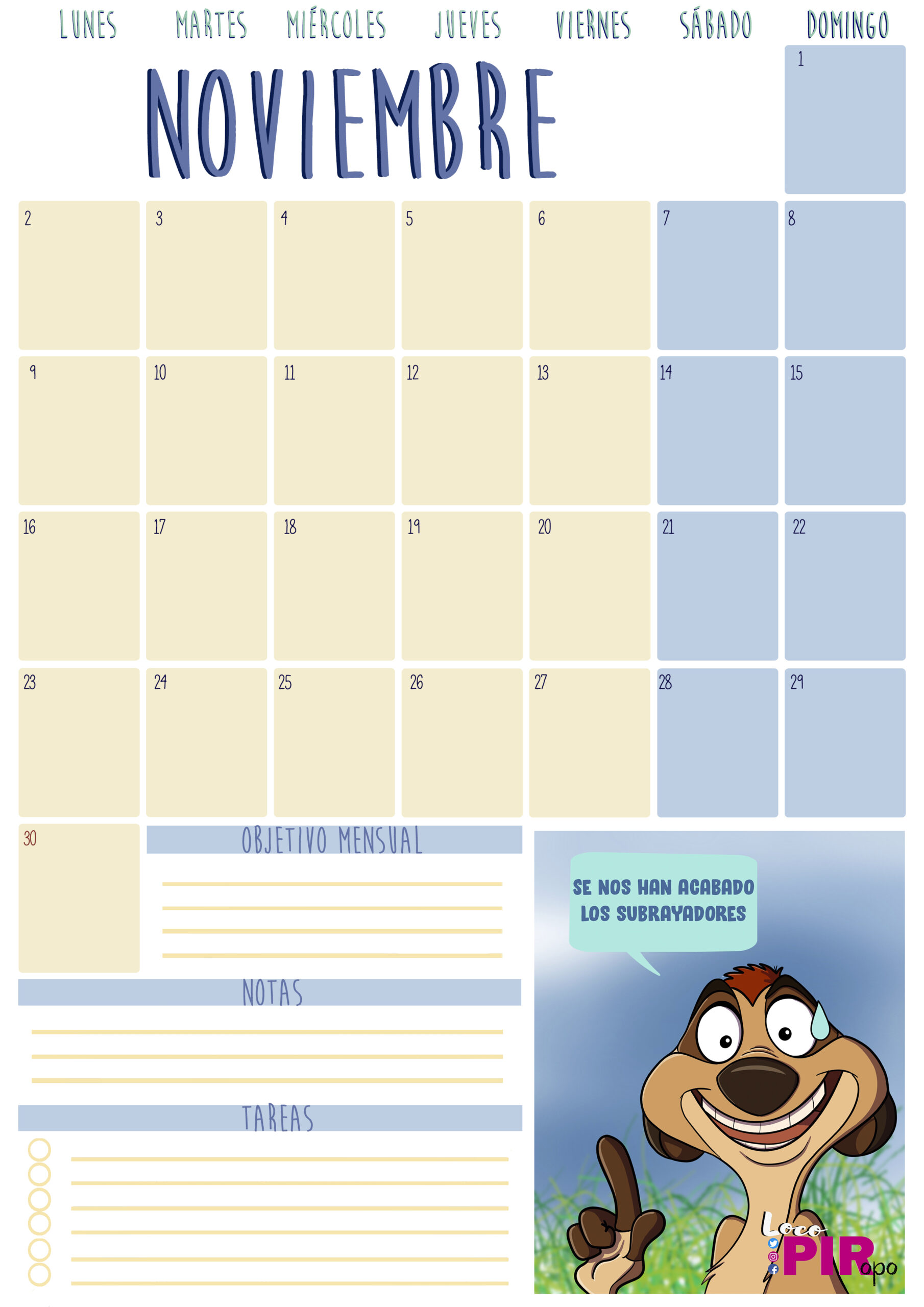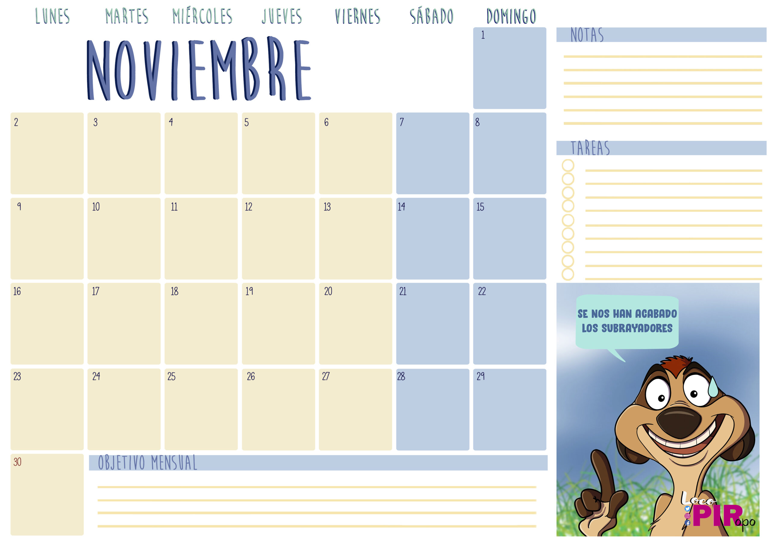 A continuación os dejo con el planning de este mes. En esta ocasión, Timón os acompañará durante el mes de noviembre.